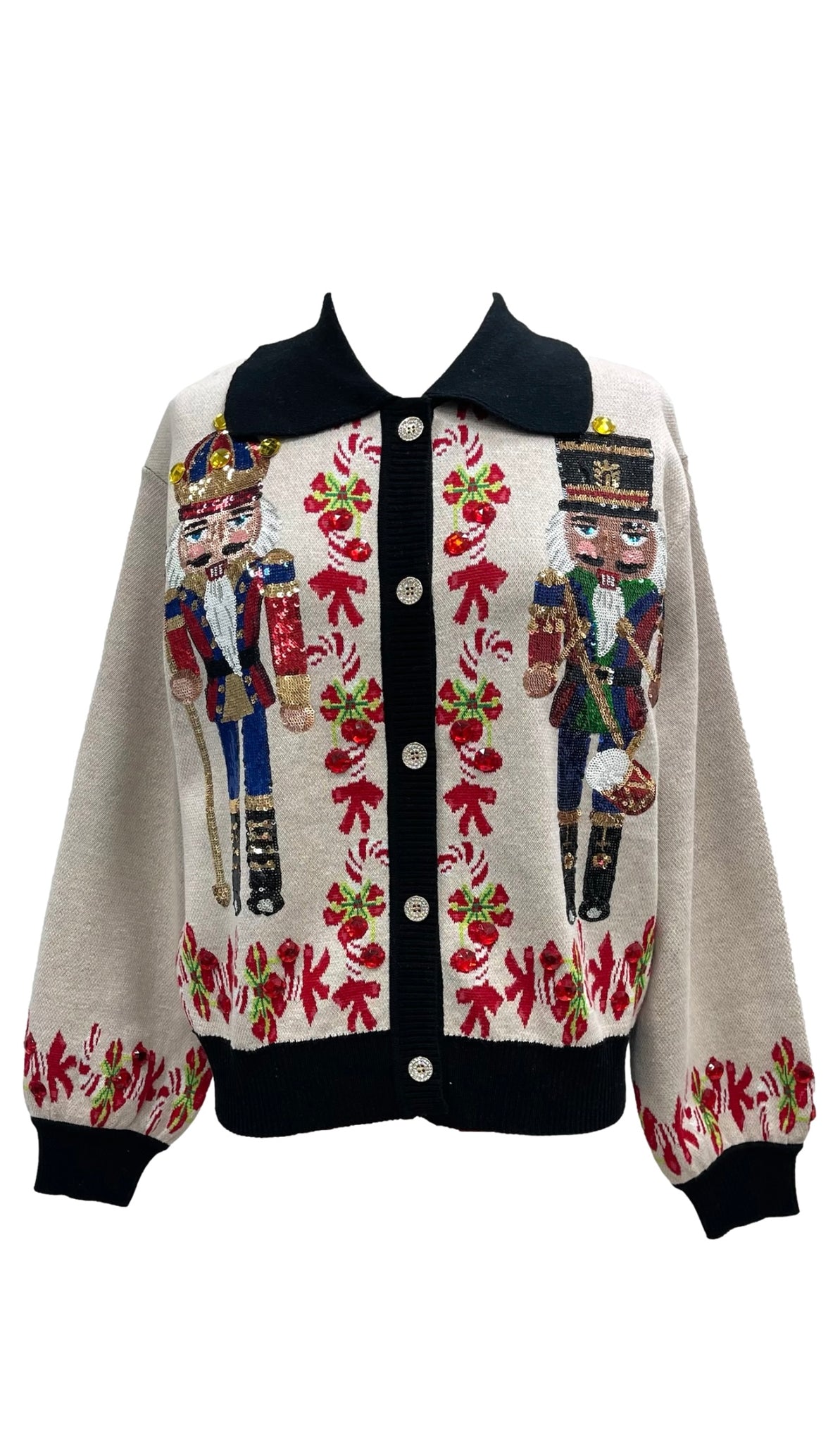 QOS Queen of Sparkles Black Trim Collar Nutcracker & Candy Cane Cardigan