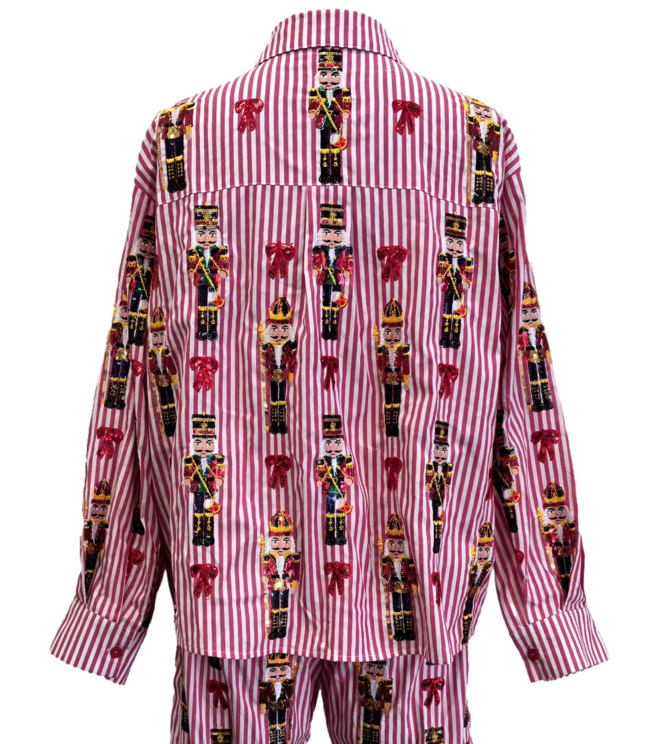 QOS Queen of Sparkles Red Stripe Scattered Nutcracker & Bow Button Up